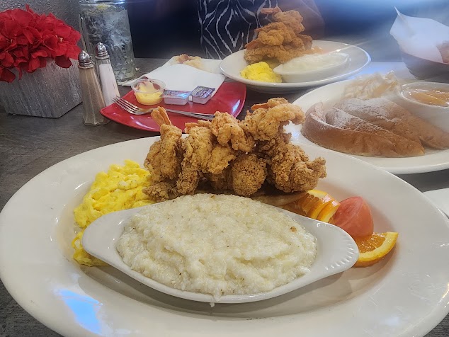 If there was nothing good about this restaurant, I would at least say that our server Joe kept us entertained and laughing with his quips. He was the only server working at least 5 tables. Please keep him around! One thing I love is fresh fruit and vegetables. The orange slices and the slice of tomatoes as a garnish was a nice touch and very good. Biscuits melted in our months upon tongue contact! The gravy for the shrimp and grits was different, but definitely had an amazing taste. The turkey patties were thick, filling and flavorful. Scrambled eggs were perfect. The French toast didn't really have much flavor, but they weren't horrible, the presentation and look overshadowed the taste. Very glad we made the stop here!