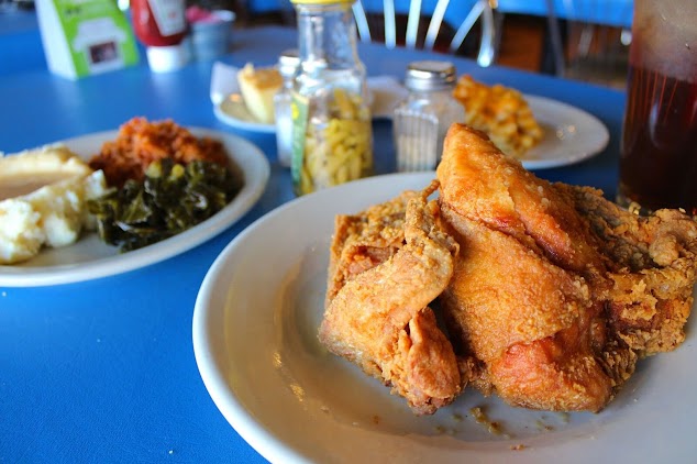 Had been looking forward to eating here for months when I planned our trip and was not disappointed. Steam table style meat plus 3. I had smothered pork chops over red rice with okra and tomatoes and Lima beans. The chops were fork tender and mmmm. Excellent gravy to go on the rice. Okra was amazing and kinda sweet My gf had the baked chicken lunch special. 2 pieces and sides. Great value. Chicken had good flavor but she shoulda got dark. She loved the collards and Mac. The peach cobbler isn't something I eat but was the reason I brought her here. She loved it The soul rolls are inventive with collard and rice egg roll style with thai chili sauce. Can't go wrong. My favorite thing I had was the okra could not eat it fast enough. Kenny and his staff are super nice and might stop by our last morning for breakfast. Parking on site