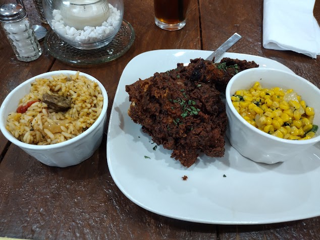 The flavor of the fried chicken was absolutely delicious and juicy. The fries had a delightful kick to them but not overpowering. Perfectly sweetened cornbread, and you can't go wrong with the Mac n cheese. Don't mind the take-out box the server thought we wanted it to go. Friendly staff. I'm definitely hitting this spot up again.