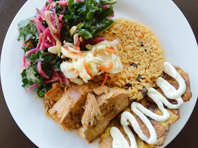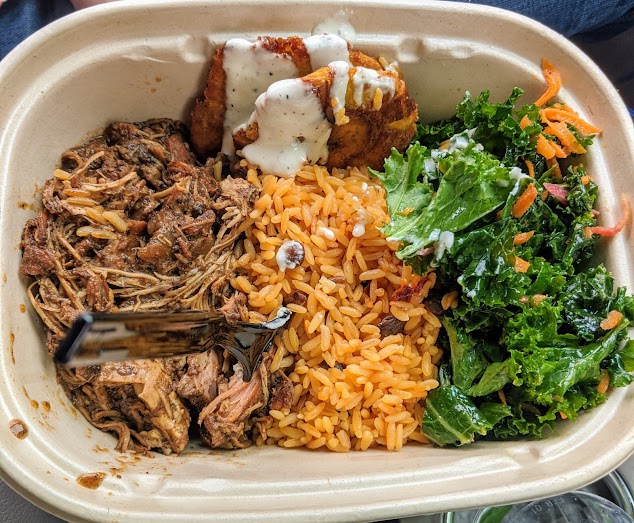 Yummy food and sizable takeout portions! We got the tofu curry and jerk chicken platters. Platters came with kale salad, seasoned rice, fried plantains. Tofu curry was really flavorful with a thick coconut curry gravy. Jerk chicken was an unusual flavor that tasted to me somewhat heavy on cardamom.