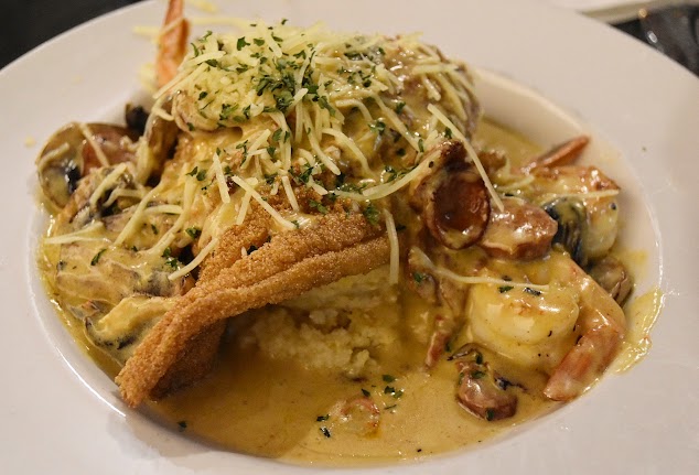 Location may be just a bit sketchy but the building the restaurant is in is well taken care so do not let that deter you from an OUTSTANDING meal! It is very much a bar atmosphere thus the service is a bit slow because the waiters are the bartenders as well. Just enjoy the time with friends or your date along with the great background music and themed drinks. Our food was the highlight of this stop. We had the salmon balls as an appetizer that were delicious and for our entree we shared the Seafood Platter. Don't let the price fool you. It is a HUGE platter with tons of fresh shrimp, thin cut Catfish filets, and the special of fried crab claws! We seen what others were eating as well and could randomly pick something off the menu and it would be delicious! This is a must stop for seafood lovers and a little bit of the Blues!!!