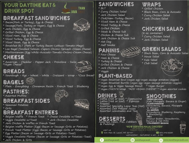 There is a Café in Laurel Maryland that has more than just coffee!! So YOU KNOW I had to go see what was up with it. I did. I’m glad. I’m full. Let me show you what I’m talking about… . Where I am: @morethanjavacafe . Location Reviewed: 358 Main St., Laurel M.D. . Menu Includes: Craft Smoothies, Bacon, Sausage, Chicken, Turkey, Ham, & Vegan Breakfast Sandwiches, Coffee, Teas, Salads, Wraps, Sandwiches, Panini’s, Vegan Options, Cold Pressed Juices, Cookies, Cakes, Pies, Muffins, & More!! . Items Reviewed: Their Halfsmoke (with peppers, onions, chips, & mustard $4.95). STAMP!! Juicy, mildly spicy, with the peppers that added flavor!! Their Curry Chicken Wrap (with mixed greens, tomato, chips, & cranberries $8.95). LIKE THAT!! The curry & mayo mixed well, with a tinge of sweetness from the cranberries. Their Green Machine Smoothie (Large with pineapple, banana, kale, agave, & ginger $6.95). STAMP!! Refreshing, tasty, & fulfilling. Their Jerk Chicken & Waffles ($12.95 with egg $1.95, & bacon $2.75). STAMP!! Oddly delicious!! The spice of the jerk, mixed with the sweetness of the maple syrup…WORKED!! Crispy bacon, & fluffy eggs too!! Their Jerk Chicken Breakfast Sandwich (on coco bread with eggs, & Pepper Jack cheese $11.20). STAMP!! Again, oddly tasty!! This sandwich was packed with meat, & a pungent jerk sauce!! GET THIS!! Their Jerk Chicken & Grits (Self explanatory $11.95). LIKE THAT!! Buttery, spicy, & meaty grits!! Their Banana Pudding ($4.95). DELICIOUS! More bananas, & softened wafers would’ve made this better. Their Lemon Cream Cheesecake Cake (homemade $5.75). STAMP!! Lemony, thick cut, with a stand out icing!! Their Blueberry Pomegranate Tea, & Strawberry Lemonade ( house made $2.95 each). STAMP!! Palate cleansing, rich in flavor juices!! . Customer Service: On Point . Online Navigation: Simple . Parking: Decent . Recommendations: Their Jerk Chicken Sandwich, Jerk Chicken & Waffles, The Curry Wrap, any smoothie & juice!! ⭐️⭐️⭐️⭐️⭐️=STAMP ⭐️⭐️⭐️⭐️➕=LIKE THAT ⭐️⭐️⭐️⭐️=DELICIOUS ⭐️⭐️⭐️=DECENT ⭐️⭐️=PASS ⭐️=NAH #Bigschlimsreviews