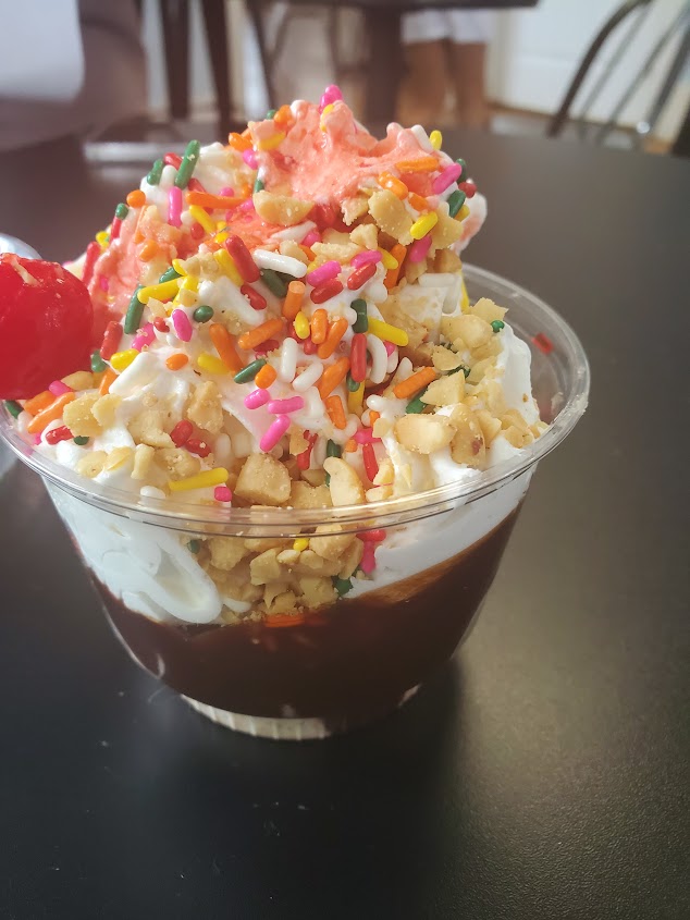 What a great local spot! The shop itself is somewhat small but has plenty of seating outdoors (and some indoors). Their prices match the large portions they serve and they have an excellent ice cream and sweets list to select from posted on the wall. Kid friendly, dog friendly (outside seating), and right off the main street in town.